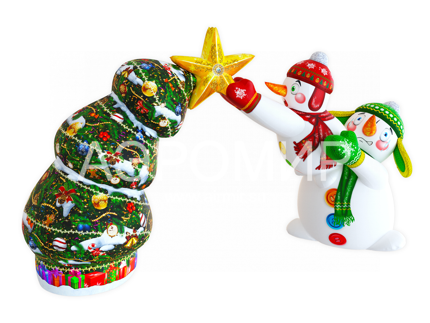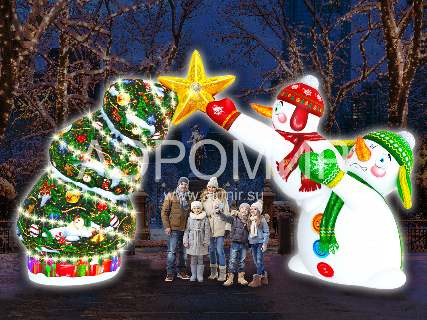 Арка «Новогодний переполох» – это эффектное украшение и оригинальная рекламная площадка! Надувная конструкция с милыми снеговиками, наряжающими елку, создает праздничное настроение. Объемная композиция прекрасно смотрится днем и волшебно светится ночью. Закажите брендирование и получите уникальную фотозону! Идеально подходит для оформления входа в парки, ледовые городки и торговые центры.