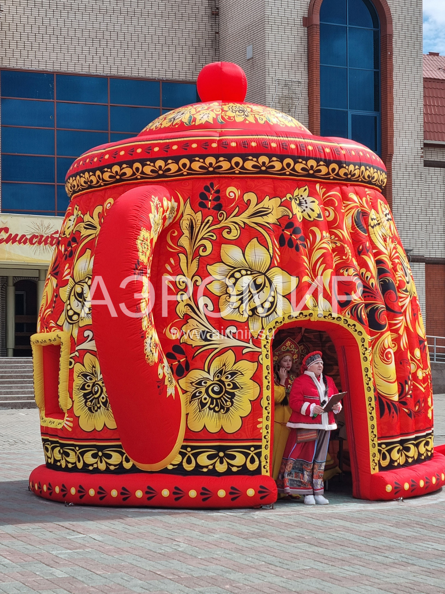 Огромный надувной дом в виде чайника, роспись традиционными русско-народными узорами. Снаружи и внутри фотопечать, есть несколько готовых вариантов росписи. Может использоваться как фотозона, место проведения мастер-классов, выставок, ярмарок. Гарантия 1 год, доставка в любую точку.