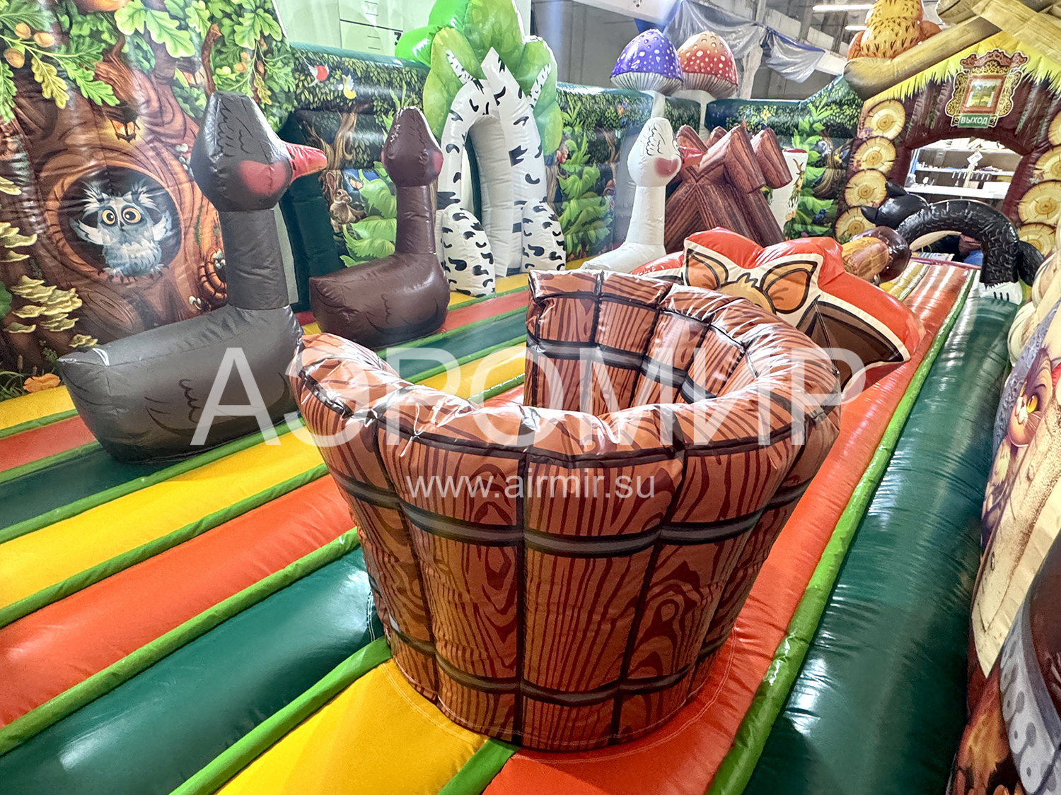 Кроме этого батут оснащен отличной большой горкой, высотой 4 метра и прыжковой зоной, тут каждый найдет себе занятие по душе. Весь аттракцион выдержан в народном стиле, его украшает полноцветная печать и надувные фигуры высокой степени детализации.