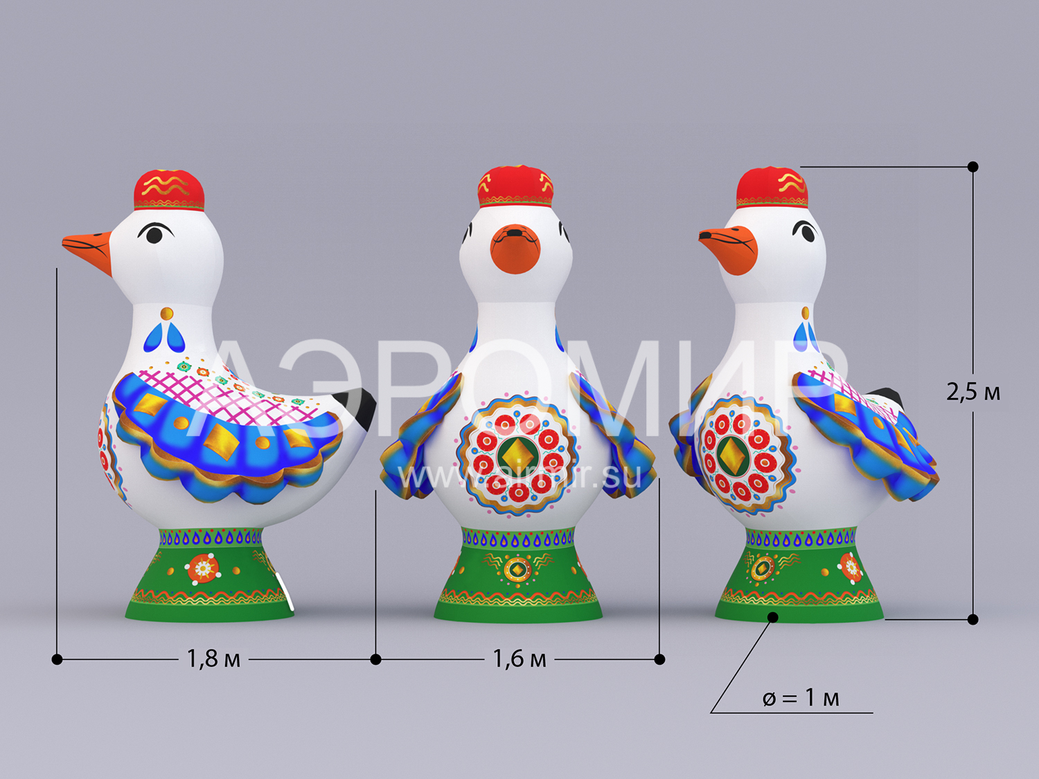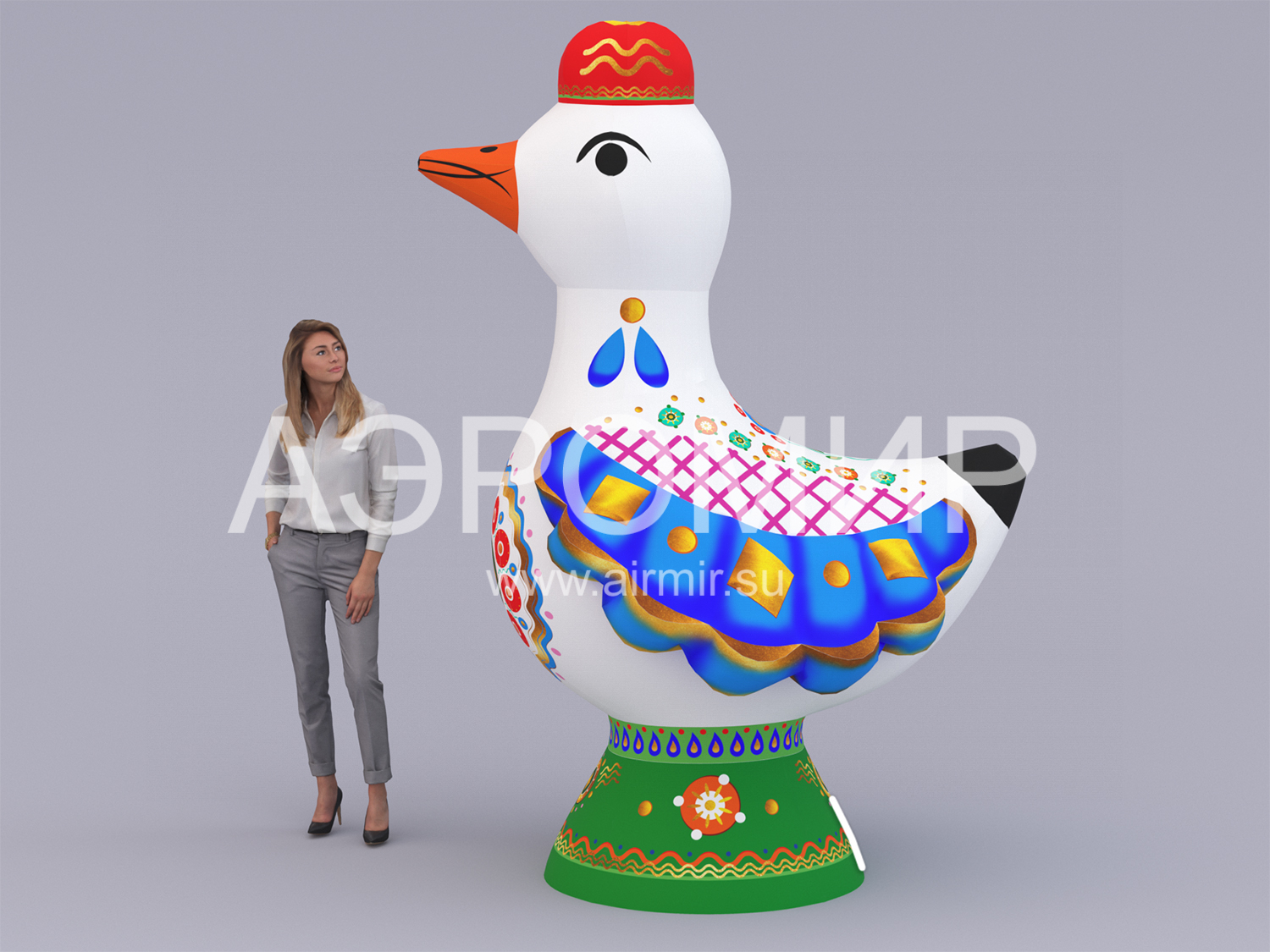 Эта очаровательная надувная уточка, выполненная в духе традиционных дымковских игрушек, станет эффектным украшением любого мероприятия. Она способна мгновенно привлечь внимание, обозначив вход на праздник или ярмарку, и привнесет праздничное настроение в интерьер дома культуры, театра, музея, библиотеки, ресторана или кафе. Благодаря своим внушительным размерам, эта заметная декорация идеально подходит для оформления городских улиц и просторных помещений, особенно во время Масленицы. Для еще большей функциональности, фигуру можно оснастить подсветкой и использовать для размещения рекламных сообщений.
