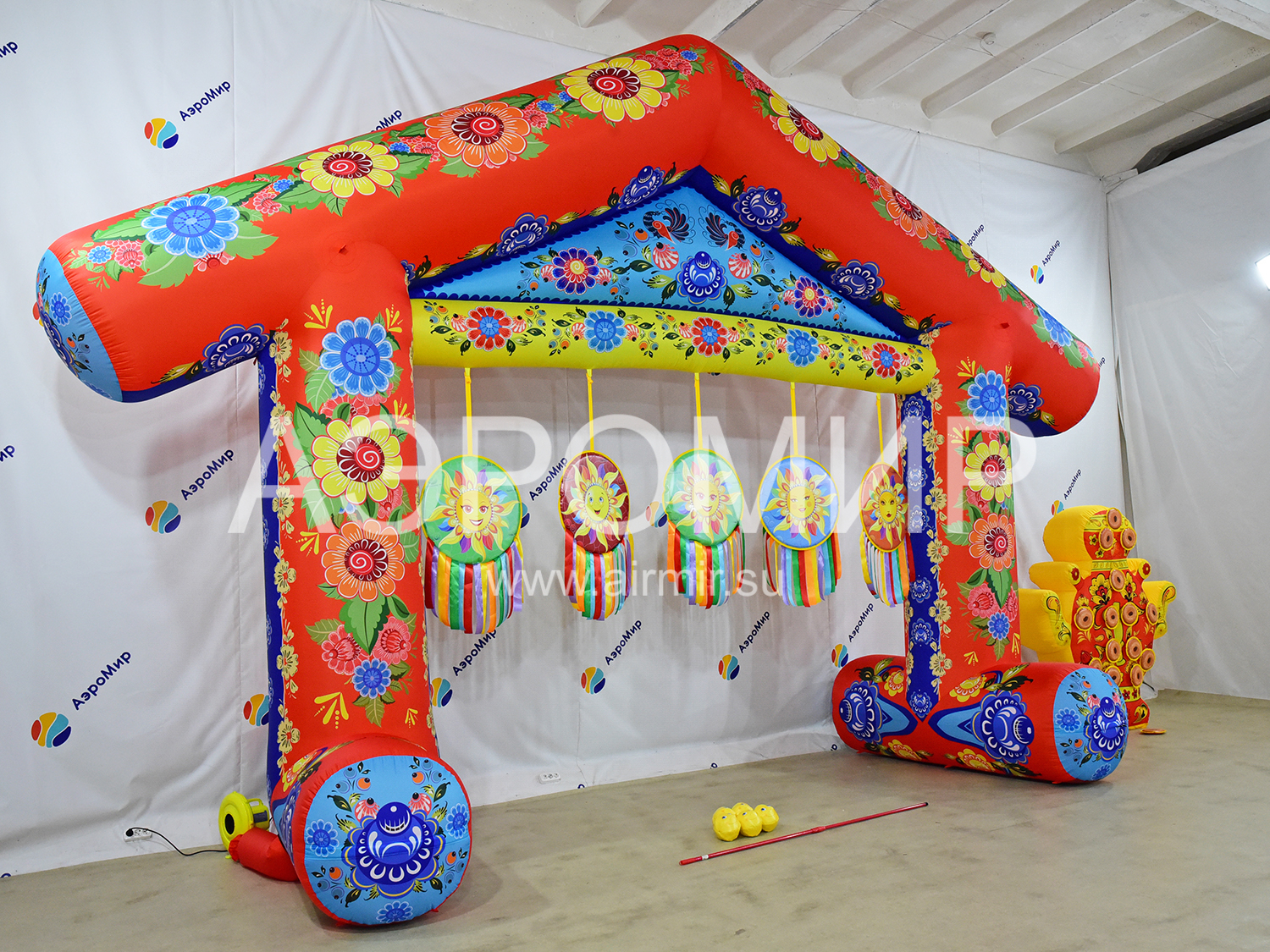 Избушка - это веселый увлекательный аттракцион на меткость и ловкость. Невероятно красивая арка стилизованная в русско-народном стиле, и блины, подвешенные сверху, которые нужно сбить яркими колобками. С аркой можно сфотографироваться, и у Вас останутся памятные атмосферные фотографии.
